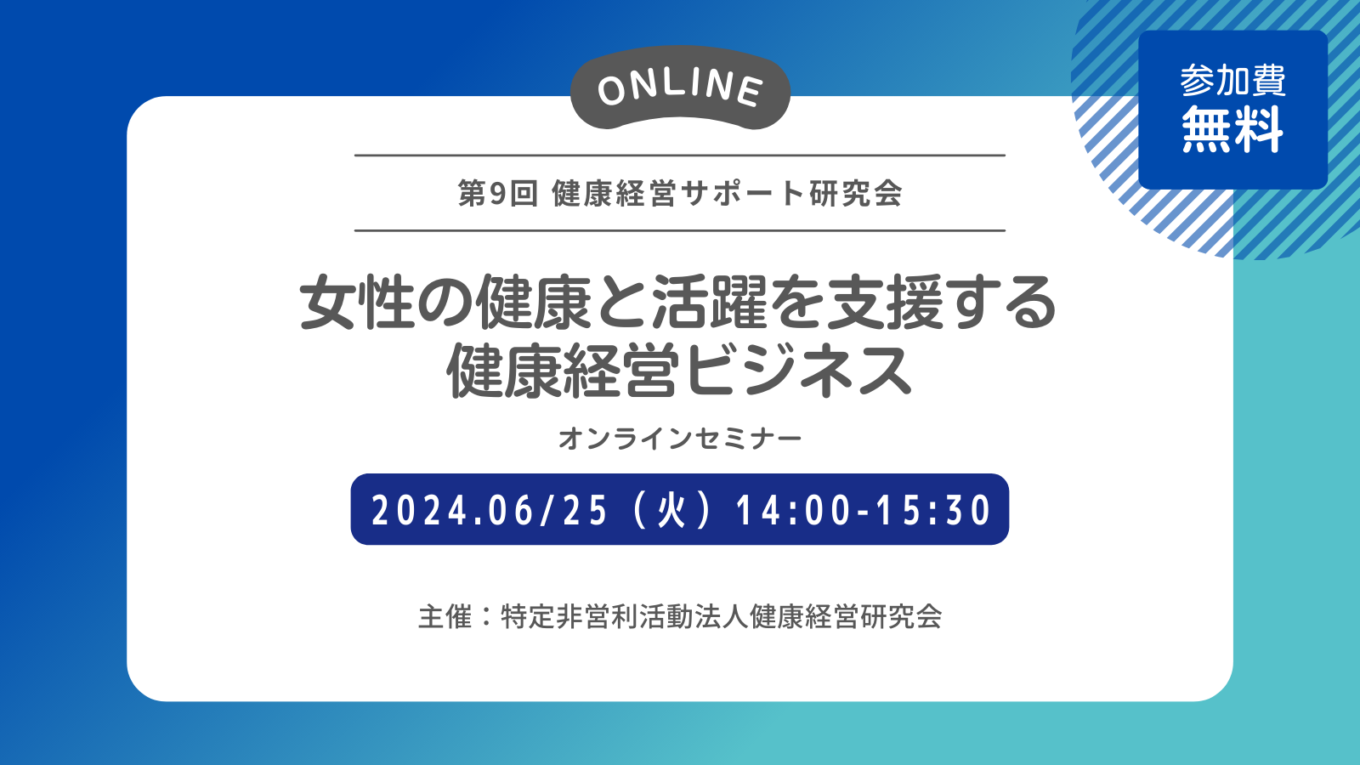 Read More2025年7月4日開催 第11回健康経営サポート研究会 開催いたします日 時 2025年7月4日(金) 13:30~15:00 場 所 オンライン(Zoomウェビナー) 主催者 特定非営利活動法人健康経営研究会 参加申込 NPO健康経営研究会では、賛助会員様の製品、サービスの発展を目的として、会員様同士の交...642025年7月4日
